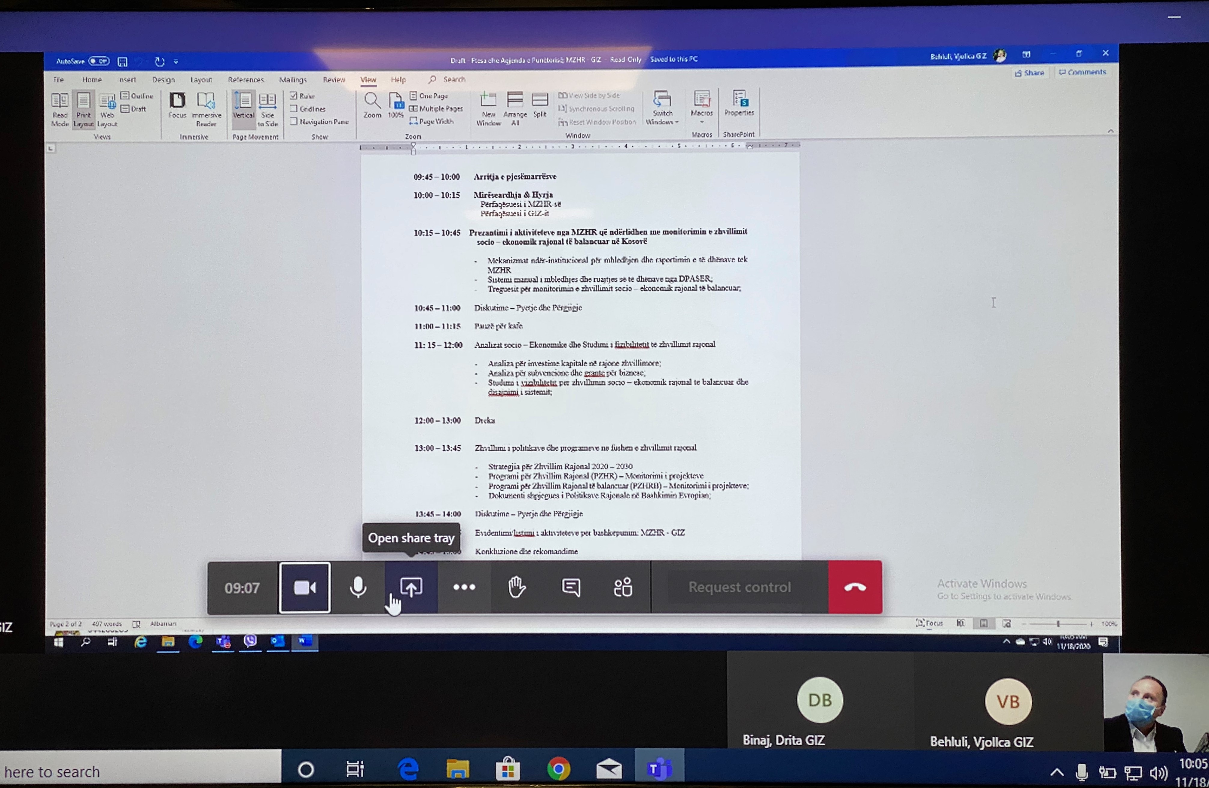 Duke parë përkushtimin dhe vullnetin e dyja palëve për bashkëpunim dhe meqenëse ekzistojnë aktivitete të përshtatshme për bashkëpunim palët vendosëm për organizimin e një punëtorie virtuale, në të cilën do të ftojnë të marrin pjesë edhe përfaqësues të gjitha njësive të MZHR-së, disa programeve të GIZ-it, si dhe të akterëve tjerë të jashtëm, si palë të treta. Marrë parasysh diskutimet e deritanishme dhe listën e aktiviteteve të shqyrtuara bashkërisht, palët potencuan se realizimi i kësaj punëtorie, do të mund të rezultojë në arritjen e një marrëveshje të bashkëpunimit për të ardhmen: MZHR – GIZ.