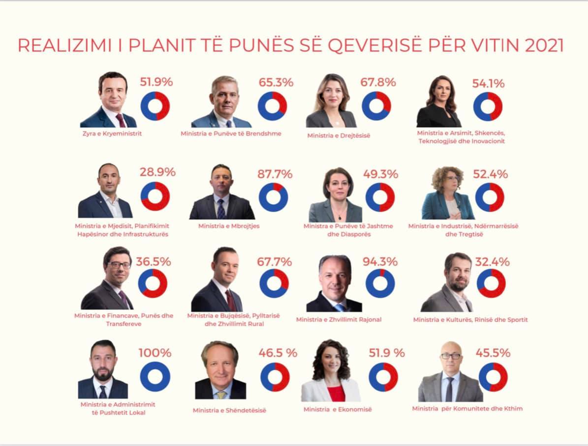 Falë punës dhe angazhimit të gjithë stafit, Ministria e Zhvillimit Rajonal vlerësohet se ka realizuar 94.3% aktivitetet e saj të parapara në Planin e Punës së Qeverisë për periudhën: Janar – Dhjetor 2021, dhe vlerësohet si ministria e dytë me performancen më të mirë që ka përmbushur planin në këtë përqindje të lartë.