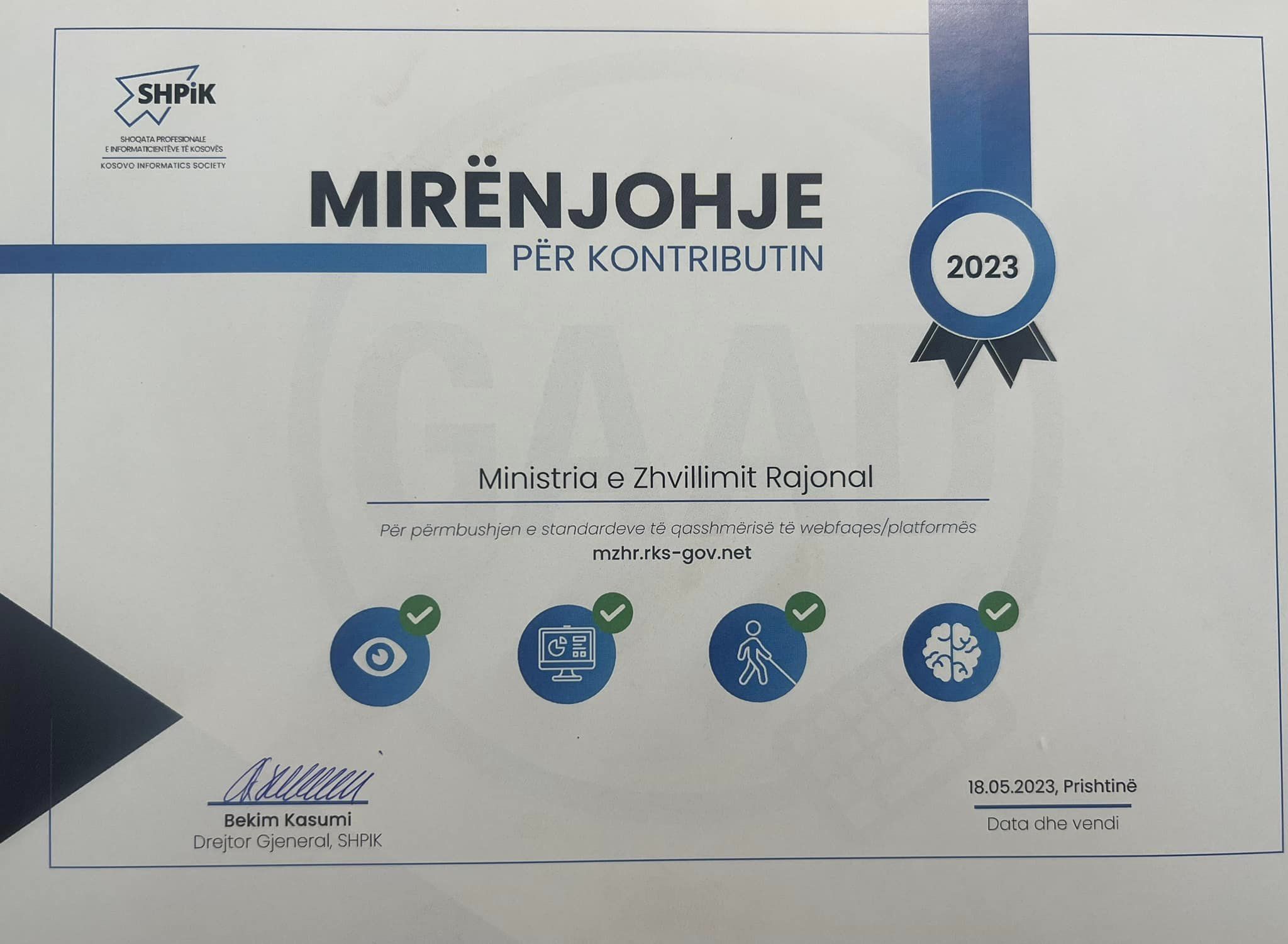 Danas, 18.05.2023.godine, Ministarstvo regionalnog razvoja, predstavljeno g-đom Artom Maloku – liderom DKP-a, učestvovalo je na konferenciji za Globalni dan pristupačnosti u organizaciji Stručnog udruženja informatičara Kosova i Udruženja slepih Kosova. .